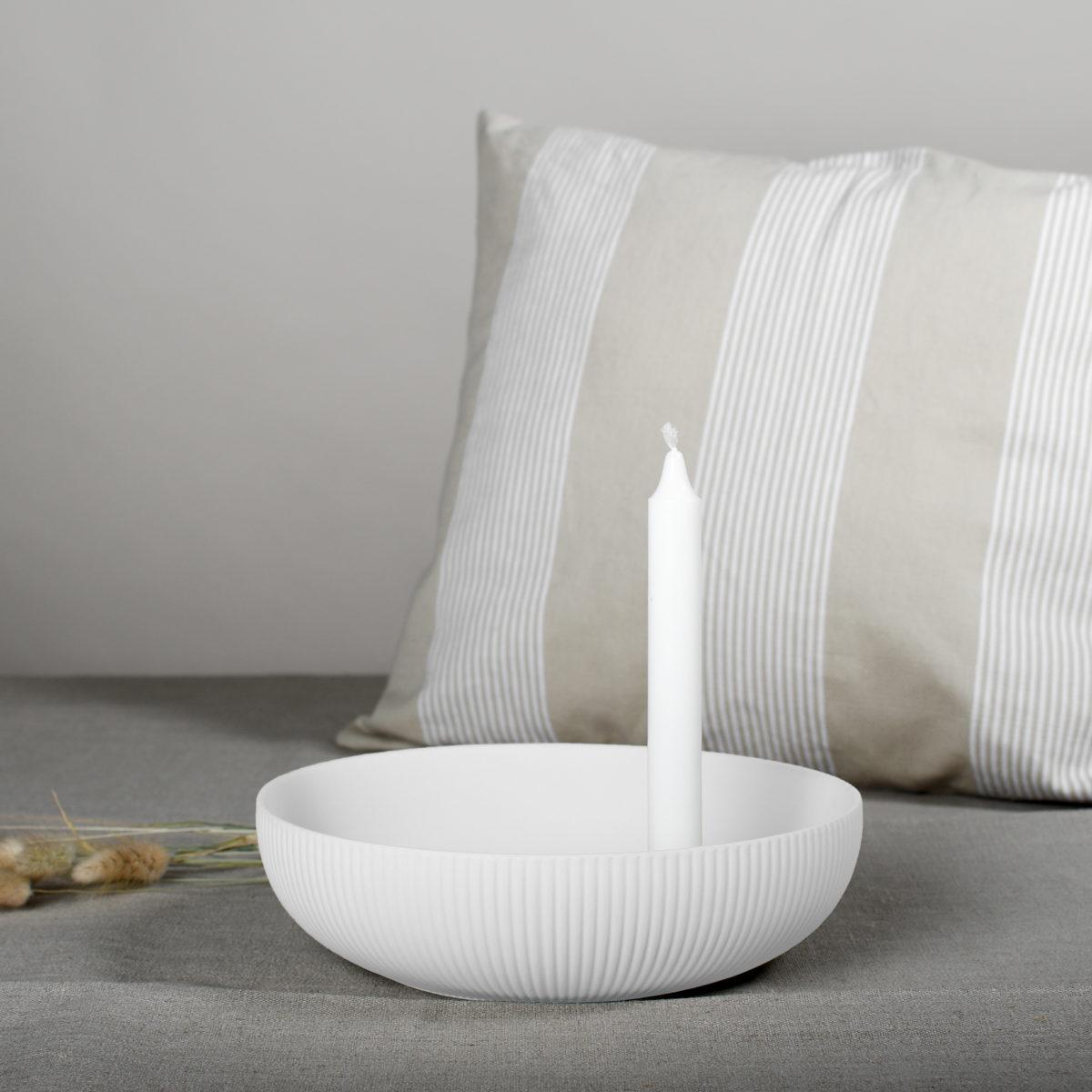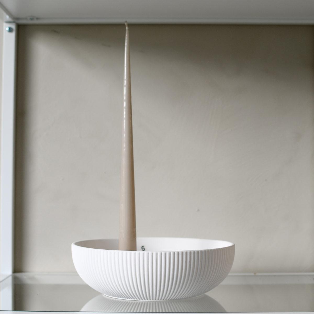 Der Kerzenhalter „Bowl“ überzeugt durch seine runde, reduzierte Form und matte Oberfläche – typisch skandinavisch inspiriert. Mit einem Durchmesser von 26 cm und einer Höhe von 7 cm bietet er nicht nur Platz für eine Stabkerze (nicht im Lieferumfang enthalten), sondern auch für liebevolle Details wie Moos, Muscheln, kleine Kugeln oder Blüten.