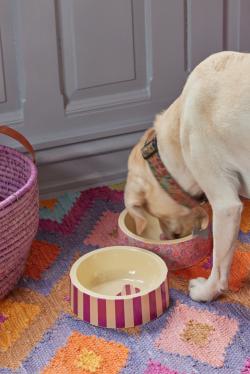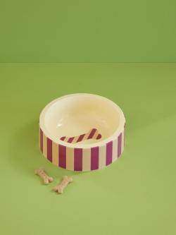 Dieser Futternapf von Rice kombiniert Funktionalität mit stylischem Design. Die vertikalen Streifen in Bordeaux und Creme machen ihn zum Hingucker im Wohnraum – und der eingelegte Knochen in der Mitte sorgt für ein charmantes Detail. Der Napf ist robust, leicht zu reinigen und für Wasser oder Futter geeignet.