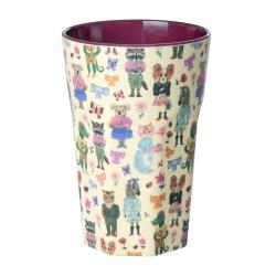 Ein echtes Lieblingsstück für Groß und Klein! Der Becher begeistert mit einem fantasievollen Design: Tiere in charmanten Outfits, umgeben von kleinen Schleifen, Blüten und Schmetterlingen. Die Außenseite ist bunt illustriert, während das Innere in einem kräftigen Bordeauxton glänzt – ein echter Hingucker auf jedem Tisch!