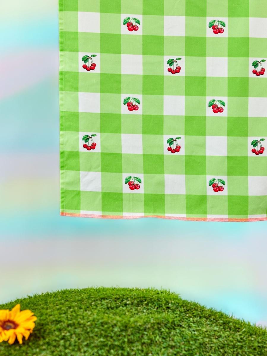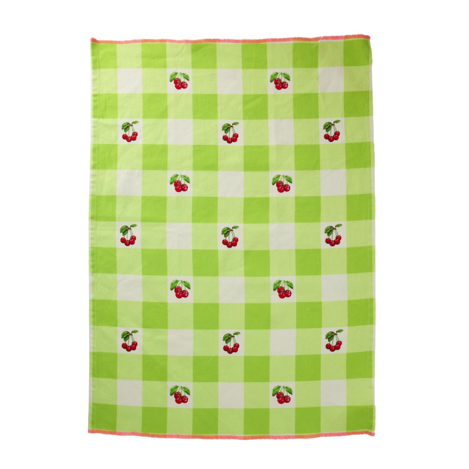 Dieses farbenfrohe Küchentuch bringt Retro-Charme und gute Laune in deine Küche! Das limettengrüne Karomuster mit kleinen Kirsch-Stickereien ist ein echter Hingucker. Entstanden in der bunten Kooperation zwischen RICE und dem italienischen Label Love Therapy, vereint es Design mit Funktion.