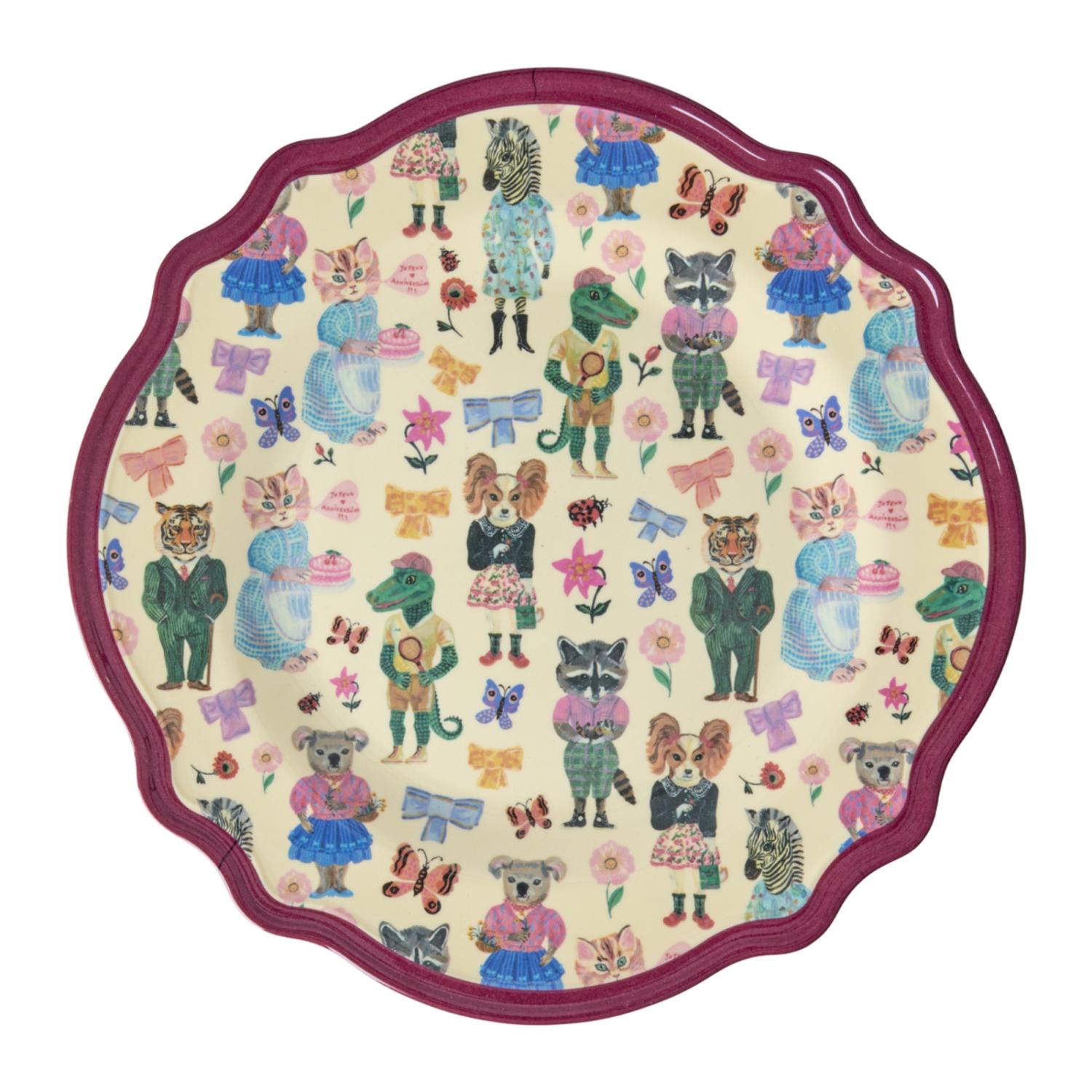 Ein echtes Statement-Stück für den Tisch: Diese grosse, runde Platte zeigt eine bunte Parade fantasievoll gekleideter Tiere – darunter Koalas, Zebras, Krokodile, Katzen, Waschbären und mehr. Umrahmt von Schmetterlingen, Blumen und Schleifen erzählt jedes Detail seine eigene kleine Geschichte.