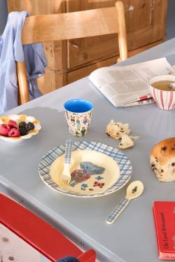 Dieser liebevoll gestalteter Tellem zeigt einen niedlichen Elefanten im tropischen Outfit, umgeben von Schmetterlingen, einer Blume und einem Marienkäfer. Der karierte Rand in Blau verleiht der Teller einen verspielten Touch.