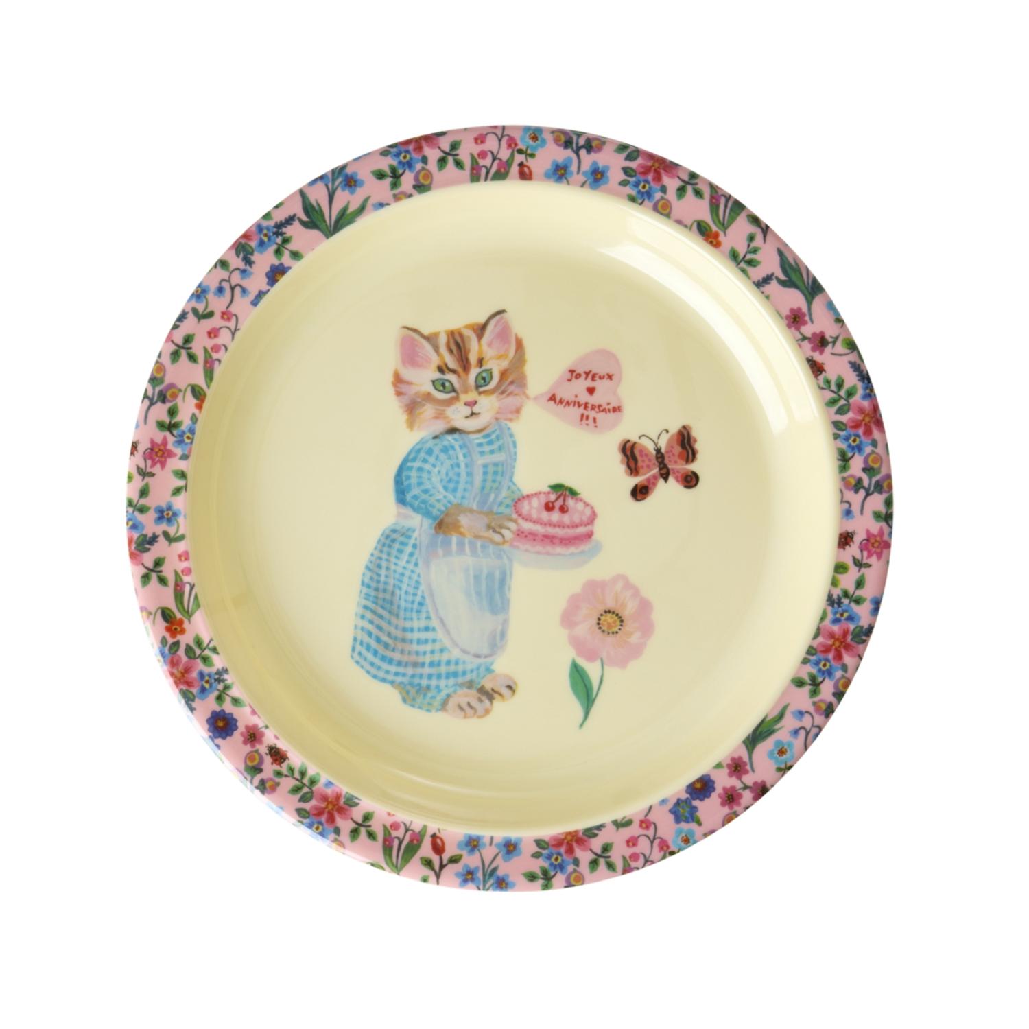 Eine kleine Katze im blauen Kleid bringt ein rosa Törtchen auf den Tisch – umgeben von einer zarten Blumenranke und begleitet von einem Schmetterling. Dieser liebevoll gestaltete Teller verzaubert mit nostalgischem Charme und ist ideal für kleine Kuchenfans und Katzenfreund:innen.