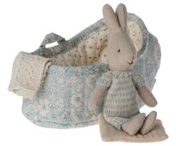 Ein Traum in Pastell! Diese zarte Tragtasche mit blumigem Stoffmuster enthält einen kleinen Hasen aus weichem Leinen, der gemütlich in seinem Mini-Körbchen liegt – inklusive Kissen und Häkeldecke. Der Hase trägt einen gestrickten Einteiler in Blau-Beige und lädt zum Spielen, Kuscheln und Träumen ein. Ideal als Geschenk zur Geburt oder für kleine Maileg-Fans.