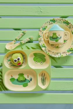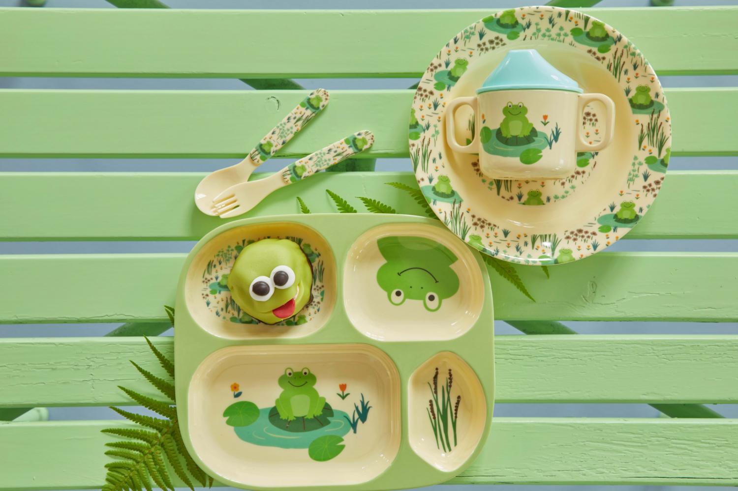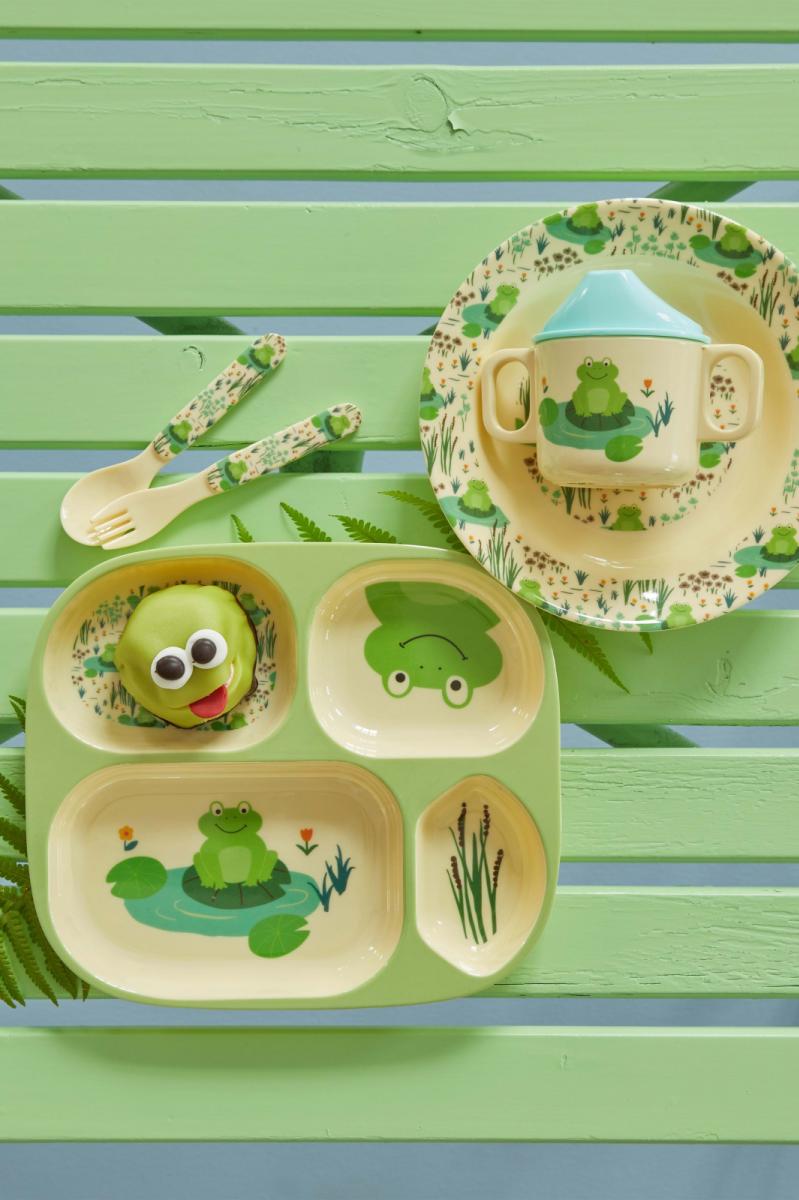 Unser beliebter und praktischer Melaminteller mit Einteilung, mit Fröschen auf hellgrünem Grund. Der Teller geeignet für die kleinsten Familienmitglieder und ihre winzigen Händchen. Serviere die verschiedenen Lebensmittel in den einzelnen Vertiefungen und lasse deine Kinder neue Geschmäcker entdecken, ohne das die einzelnen Speisen in Kontakt kommen. Farbenfroher und praktischer Spaß am Essen für Kinder!